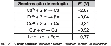 Sua produção consiste na mistura de uma solução aquosa de sulfato de cobre(II), CuSO4, com óxido de cálcio, CaO, e sua aplicação só deve ser realizada se estiver levemente básica. A avaliação rudimentar da basicidade dessa solução é realizada pela adição de três gotas sobre uma faca de ferro limpa. Após três minutos, caso surja uma mancha avermelhada no local da aplicação, afirma-se que a calda bordalesa ainda não está com a basicidade necessária. O quadro apresenta os valores de potenciais padrão de redução (E°) para algumas semirreações de redução.