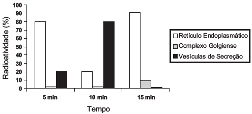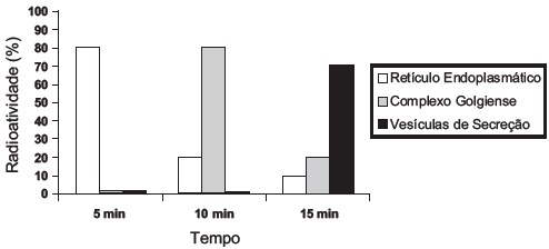 Após esses ensaios de radioatividade, qual gráfico representa a evolução temporal da produção de proteínas e sua localização em uma célula secretora?