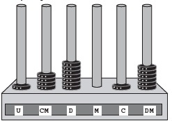 O ábaco é um antigo instrumento de cálculo que usa notação posicional de base dez para representar números naturais. Ele pode ser apresentado em vários modelos, um deles é formado por hastes apoiadas em uma base. Cada haste corresponde a uma posição no sistema decimal e nelas são colocadas argolas; a quantidade de argolas na haste representa o algarismo daquela posição. Em geral, colocam-se adesivos abaixo das hastes com os símbolos U, D, C, M, DM e CM que correspondem, respectivamente, a unidades, dezenas, centenas, unidades de milhar, dezenas de milhar e centenas de milhar, sempre começando com a unidade na haste da direita e as demais ordens do número no sistema decimal nas hastes subsequentes (da direita para esquerda), até a haste que se encontra mais à esquerda. Entretanto, no ábaco da figura, os adesivos não seguiram a disposição usual.
