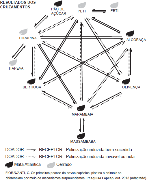 O processo de formação de novas espécies é lento e repleto de nuances e estágios intermediários, havendo uma diminuição da viabilidade entre cruzamentos. Assim, plantas originalmente de uma mesma espécie que não cruzam mais entre si podem ser consideradas como uma espécie se diferenciando. Um pesquisador realizou cruzamentos entre nove populações – denominadas de acordo com a localização onde são encontradas – de uma espécie de orquídea (Epidendrum denticulatum). No diagrama estão os resultados dos cruzamentos entre as populações.