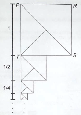 O quadrado PRST, com lado de medida 1, é o ponto de partida. O segundo quadrado é construído sob ele tomando-se o ponto médio da base do quadrado anterior e criando-se um novo quadrado, cujo lado corresponde à metade dessa base. Essa sequência de construção se repete recursivamente.
