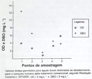 Pesquisadores coletaram amostras de água de um no em pontos diferentes, distantes alguns quilômetros um do outro. Ao longo do rio, há locais de águas limpas, como também locais que recebem descarga de esgoto de área urbana, e locais onde há decomposição ativa com ausência de peixes. Os pesquisadores analisaram dois parâmetros: oxigênio dissolvido (OD) e demanda bioquímica de oxigênio (DBO) em cada ponto de coleta de água, obtendo o gráfico: