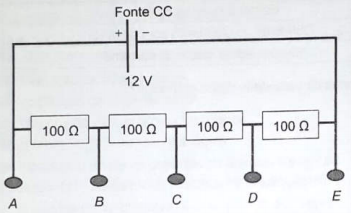 Um estudante tem uma fonte de tensão com corrente continua que opera em tensão fixa de 12 V. Como precisa alimentar equipamentos que operam em tensões menores, ele emprega quatro resistores de 100 Ω para construir um divisor de tensão. Obtém-se este divisor associando os resistores, como exibido na figura. Os aparelhos podem ser ligados entre os pontos A, B, C, D e E, dependendo da tensão especificada.