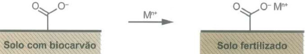 Admite-se que o efeito do biocarvão na fertilização do solo estava, em parte, relacionado à presença de grupos orgânicos do tipo carboxilato em sua superfície, carregados negativamente (─COO-). Esses grupos atraem íons positivos necessários como nutrientes, tais quais os provenientes do potássio (K), do cálcio (Ca) e do magnésio (Mg), além de micronutrientes, como zinco (Zn) e ferro (Fe). Essa ligação no solo fertilizado é predominantemente iônica, conforme ilustra a figura, em que M+ representa os cátions metálicos. De acordo com a escala de Pauling, a eletronegatividade do elemento oxigênio é igual a 3,44.