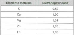 O quadro apresenta os valores de eletronegatividade desses cinco elementos metálicos.
