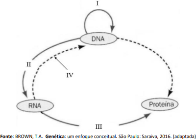 O esquema a seguir representa o Dogma Central da Biologia Molecular, indicando o fluxo de informações do código genético.