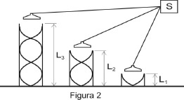 O sensor registra a frequência aparente devido à sua movimentação em relação à fonte sonora e a reenvia para um laboratório onde um sistema de caixas sonoras, acopladas a três tubos sonoros, de comprimentos L1, L2 e L3 , reproduz essa frequência aparente fazendo com que as colunas de ar desses tubos vibrem produzindo os harmônicos apresentados na Figura 2.
