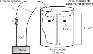 Para a determinação deste volume d’água os alunos deveriam utilizar somente um circuito elétrico constituído de um voltímetro ideal V, uma bateria de fem igual a 12 V e resistência interna igual a 1Ω, além de um resistor ôhmico R igual a 2Ω e um reostato AB, feito de material de resistividade elétrica constante, cuja resistência elétrica pode variar de 0 a 4Ω , de acordo com a posição da bóia que é ajustada pela altura do nível d’água do reservatório. Depois de algum tempo, os alunos apresentaram o projeto ao professor, conforme esquematizado na figura a seguir.