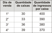 Do 2º dia de venda em diante, foram disponibilizadas 3 caixas a mais em cada dia, porém, em cada caixa, do total de caixas do dia, havia 10 ingressos a menos. O quadro apresenta a sequência até o 4º dia.