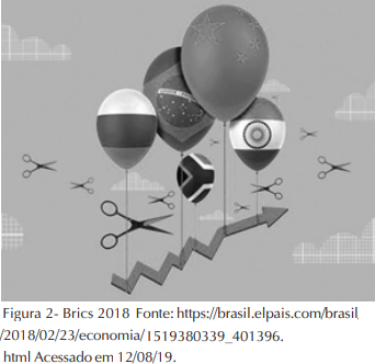 Analise o gráfico que apresenta a porcentagem do PIB global do BRICS e do G7, en