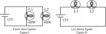 Recentemente a legislação brasileira passou a determinar que os veículos trafeguem nas estradas com os faróis baixos acesos durante o dia ou uma outra lâmpada própria para isso, chamada luz diurna. Os carros geralmente possuem duas lâmpadas dos faróis baixos e duas lâmpadas dos faróis altos. Para obedecer a essa legislação, evitar que o usuário esqueça de acender os faróis e para preservar o uso das lâmpadas de farol baixo sem a necessidade da inclusão de lâmpadas extras, um determinado fabricante de automóveis optou pela seguinte solução descrita a seguir. Os carros dessa marca possuem as lâmpadas de farol alto com dois modos diferentes de associação elétrica. No primeiro modo, chamado “farol alto”, as lâmpadas são ligadas em paralelo entre si e à bateria do carro (12 V). As lâmpadas são iguais e dissipam a potência de 60 W cada uma. Esse modo está representado na figura I a seguir. No segundo modo, um sistema automatizado foi feito de tal forma que ao ligar o carro, se os faróis estiverem desligados, esse sistema associa as duas lâmpadas de farol alto em série e essa associação é chamada de “modo luz diurna”, representado pela figura II a seguir.