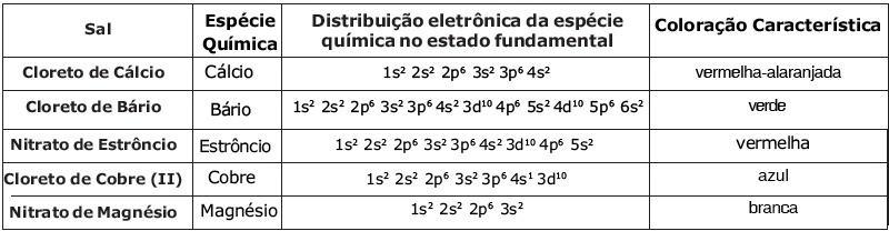 III) Tabela com espécies químicas, suas distribuições eletrônicas e colorações características: