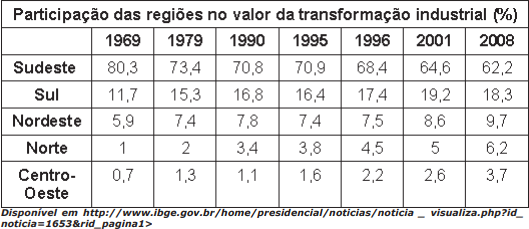 Analise a tabela a seguir referente à participação das regiões brasileiras no valor da transformação industrial: