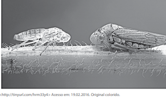 Figura de um inseto (à direita) e seu exoesqueleto (à esquerda) após a ocorrência da muda ou ecdise.