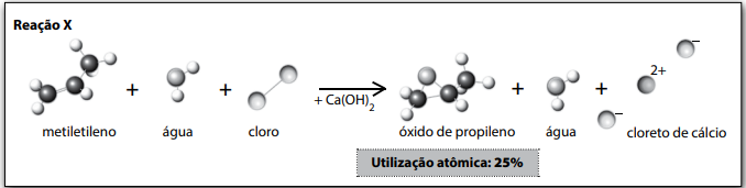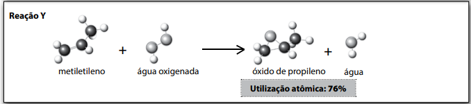 Na reação “X”, apenas 25% da massa de todos os átomos que constituem os reagentes é incorporada no produto final, o óxido de propileno. Já a reação “Y” utiliza água oxigenada (peróxido de hidrogênio) para oxidar o metiletileno, sendo uma molécula de água o único subproduto gerado. Neste caso, a economia atômica é muito superior, já que 76% da massa atômica inicial está presente no produto final. Além disto, na reação “X” é produzido um sal de cloreto de cálcio, que terá depois de ser separado do óxido de propileno, requerendo gasto adicional de solvente, energia e tempo, ao passo que na reação “Y” é apenas necessário evaporar a água presente na mistura reacional. Por último, a reação “Y” utiliza peróxido de hidrogênio, um reagente menos nocivo que o cloro (cloro-hidrina) e não produz resíduos tóxicos. É pelas três razões assim apresentadas que a reação “Y” é mais “verde” que a reação “X”, causando menor impacto ambiental e consequentemente preservando a biodiversidade.