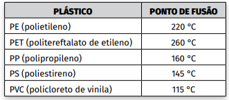 Os plásticos podem ser moldados, pois “amolecem” com o calor, chegando a sofrer fusão em determinadas temperaturas. O quadro apresenta o ponto de fusão de alguns tipos de plásticos.