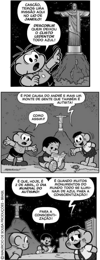 O Instituto Mauricio de Sousa publicou nesta terça-feira, dia 2 de abril, Dia Mundial da Conscientização sobre o Autismo, uma tirinha inédita com a participação da Turma da Mônica e o personagem autista André, criado especialmente para falar sobre o assunto.