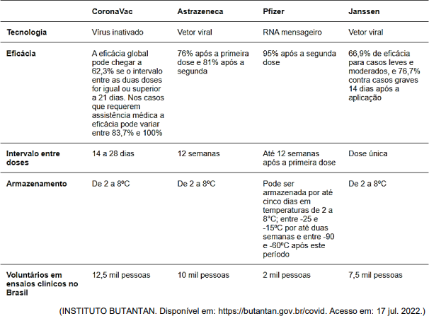 “Apesar de nenhuma vacina ser 100% eficaz, hoje a imunização é essencial para prevenir óbitos, casos graves da Covid-19 e para conter a pandemia. Quatro vacinas contra a doença já receberam autorização da Agência Nacional de Vigilância Sanitária (Anvisa) para uso no Brasil (...) mas somente as três primeiras estão sendo utilizadas no Programa Nacional de Imunizações (PNI), do Ministério da Saúde, até o momento. (...) Vale ressaltar que comparar a eficácia das vacinas e tentar eleger a melhor entre elas pode levar a conclusões enganosas. (...) Houve rigor científico em todos os testes e dados que comprovaram segurança e eficácia (...)”