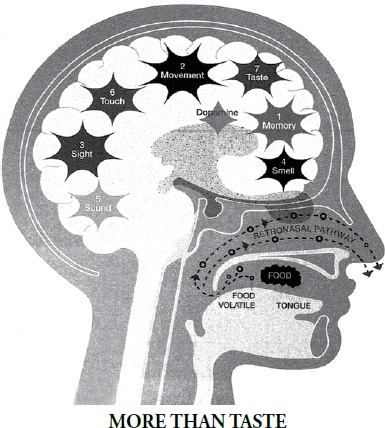 A brain primed for pleasure begins to receive sensory impulses from the food as we move it to our mouth, see its colors and shapes, and inhale its aromas.