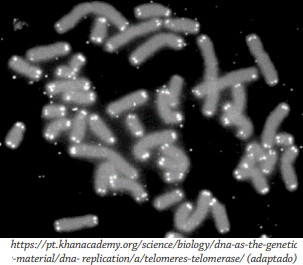 A respeito dos pontos brilhantes nas extremidades de cada cromossomo na figura mostrada acima, e que têm relação com o descrito no extrato textual, considere as imediatas afirmações.