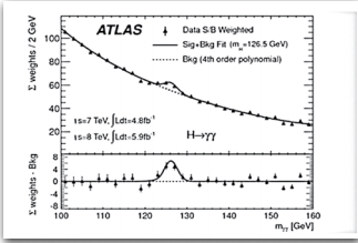 I can’t show you something which is definitely the new boson, but I can show evidence for it, for example ∈ the picture below. It shows the distribution (black …) of the mass you get when you combine the energy and momenta2 of pairs of photons (particles of light)∈ the ATLAS detector. The bump shows that there are more of these photon pairs at masses corresponding to around 125 GeV than would be expected from the trend. This excess ⟹ the existence of a particle at about this mass which decays to pairs of photons.
