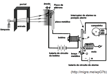 A luz proveniente de uma lâmpada de filamento passa através de aberturas na lateral do portal e incide numa placa metálica colocada ao lado dele. Essa placa, ao ser iluminada, libera elétrons da sua superfície. O fluxo desses elétrons através do fio constitui a corrente elétrica que passará na bobina, fazendo-a atuar sobre o braço metálico de aço, o que evita o acionamento da campainha.