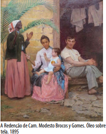 Foi assim que a raça gerada por Cam, na terra adusta da África, ficou sendo preta e feia, maltratada e escrava. No grande quadro do meu amado Brocos, aquela admirável preta velha, de mãos erguidas ao céu, é a descendente d’aquele mau filho, que, tendo visto bêbado o pai, teve a ousadia de achar engraçada a sua patriarcal bebedeira. (...) Na sua grande tela belíssima, já a filha da velha preta está meio lavada da maldição secular: já não tem na pele a lúgubre cor da noite, mas a cor indecisa de um crepúsculo. (...) Vede a aurora-criança como sorri e fulgura, no colo da mulata, - aurora filha do dilúculo, neta da noite... Cam está redimido! Está gorada a praga de Noé!