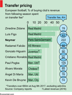 For football clubs, August is often the costliest month, when they make vast bids for each other’s players. This year has been particularly lavish. On August 3rd Paris SaintGermain (PSG), a French team, signed Neymar da Silva Santos Júnior, a Brazilian forward, from Barcelona for €222m ($264m), more than twice the prior record price for a footballer.