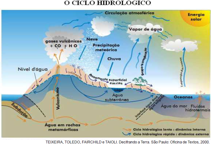A água é um elemento vital para a evolução e dinâmica geológica. De forma cíclica, percorre as diversas camadas terrestres (atmosfera, litosfera, hidrosfera e biosfera), apresentando-se nos diversos estados físicos da matéria ( sólido, líquido e gasoso), modelando a superfície terrestre e, também, garantindo a manutenção da vida na Terra.