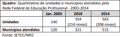 A criação de 214 novas unidades, até 2010, representou o alcance de uma capilaridade sem precedentes na educação federal, o que contribuiu decisivamente para o desenvolvimento de cada região do país. Com a criação de mais 208 unidades, em 2014, a rede estará presente em um número de municípios mais de quatro vezes maior que em 2003.