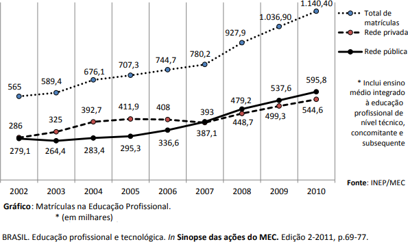 De 1909 a 2002, foram construídas 140 escolas técnicas. Até 2010, foram entregues 214 novas unidades. Além da expansão física, o governo federal modernizou a reorganizou a rede, além de garantir condições técnicas e administrativas para o desenvolvimento da nova política da educação profissional.