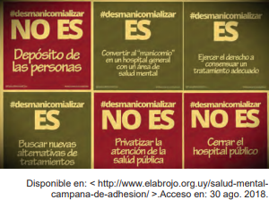 En el texto aparece el vocablo “desmanicomializar”. El uso de ese neologismo generado por la introducción del prefijo procedente del latín “des”, que denota la negación o inversión del significado del vocablo formante simple, procura traer por la campaña el concepto de que los manicomios deben sufrir cambios.