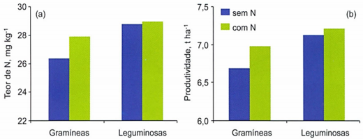 Figura – (Gráfico a) Teor de Nitrogênio (N) em mg.kg-1 nas folhas no estádio de florescimento. (Gráfico b) Produtividade de milho (t.ha-1 = tonelada por hectare) cultivado sobre palhada de gramíneas e leguminosas, com e sem aplicação de Nitrogênio (N).