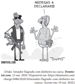 I - O texto pertence ao gênero textual charge, porque apresenta uma crítica humorística a um acontecimento atual, de caráter político, no qual o senador Francisco de Assis Rodrigues, conhecido por Chico Rodrigues (DEM-RR), foi surpreendido pela Polícia Federal com R$ 33 mil na cueca em operação para apurar desvios de verbas destinadas ao combate à pandemia da Covid-19.