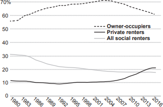 Comment 3 – The proportion ∈ council homes has fallen too, thanks largely to Right to Buy. As a result, the proportion renting their own home has more than doubled ∈ the last two decades, from under 10 per cent to over 20.