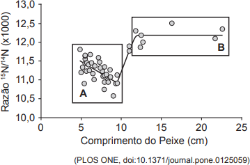 Existem dois isótopos estáveis de nitrogênio, 14N e 15N, que diferem pelo número de nêutrons (7 e 8 respectivamente). O isótopo 14N é o mais abundante, representando 99,6% do nitrogênio presente na Terra. As proporções relativas 15N/14N, entretanto, variam nos organismos vivos e são utilizadas para análise de ecologia trófica, pois a razão 15N/14N reflete as fontes alimentares e a posição trófica relativa de um organismo. De forma aproximada, os organismos produtores apresentam os menores valores da razão 15N/14N , ocorrendo um aumento gradativo de 3‰ na razão 15N/14N a cada nível trófico adicional (consumidores primários, secundários e terciários). A figura abaixo representa a variação da razão 15N/14N (x 1000) em função do comprimento total (cm) de Lycengraulis grossidens, peixe conhecido como manjuba ou manjubão, espécie frequente no litoral brasileiro.