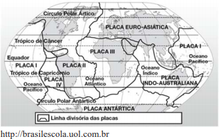 De acordo com a Teoria da “Tectônica das Placas”. Admite-se que a litosfera é constituída por placas que se movimentam, provocando uma intensa atividade geológica que resulta, entre outros efeitos, em terremotos e vulcões, principalmente nos limites das placas.