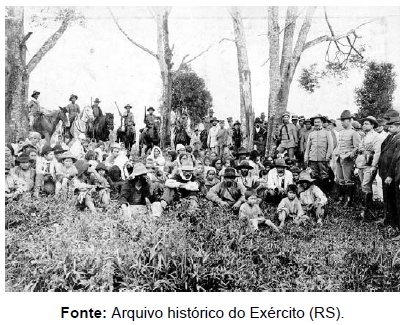 A imagem fotográfica abaixo foi feita durante a Guerra do Contestado, movimento social ocorrido na fronteira do Paraná com Santa Catarina, entre 1912-1916. Trata-se de um registro de grupo de sertanejos que se renderam às forças oficiais brasileiras no ano de 1914. Os rebeldes estão sentados, enquanto representantes das forças políticas e militares da época aparecem de pé.