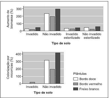 Os gráficos registram resultados de um experimento em que os pesquisadores cultivaram plântulas de três árvores da América do Norte — bordo doce, bordo vermelho e freixo branco — em solos diferentes. Duas amostras de solo foram coletadas de um local onde a erva-alheira estava crescendo, e uma dessas amostras foi esterilizada. As outras duas amostras de solo foram coletadas de um local livre da erva-alheira, e uma delas foi igualmente esterilizada.