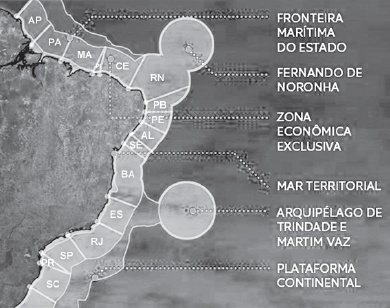 Nesse contexto e com base no mapa e nos conhecimentos sobre as fronteiras marítimas brasileiras, marque V nas afirmativas verdadeiras, e F, nas falsas.