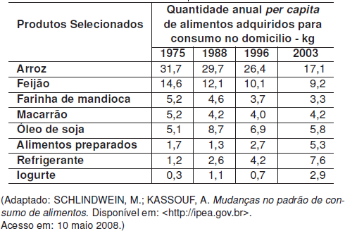 Com base no Texto, na Tabela e nos conhecimentos sobre o processo de urbanização e suas implicações no padrão de consumo alimentar, considere as afirmativas.