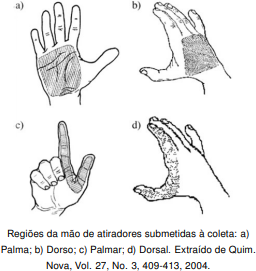 Cerca de 50% das mortes foram ocasionadas por armas de fogo sendo a maioria das vítimas mulheres negras. A identificação do autor do disparo é realizada pela polícia por meio da determinação dos elementos chumbo, bário e antimônio expelidos no momento do tiro e que podem ficar retidos nas mãos. A figura exibe as regiões da mão em que as coletas são realizadas, sendo a Palmar e a Dorsal onde mais se concentram os metais.