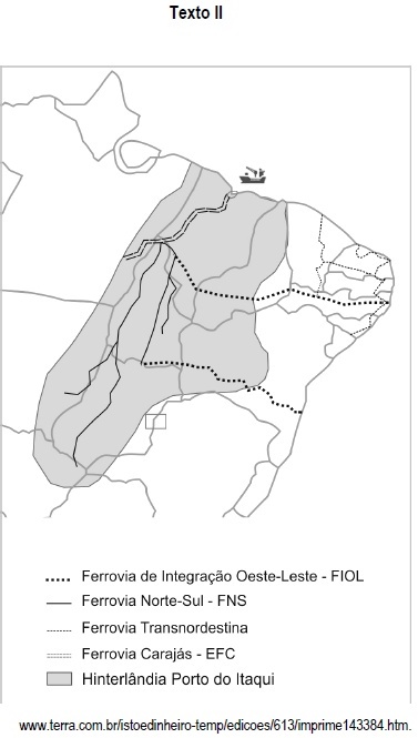 Nas opções, o numeral 1 representa o contexto socioeconômico do Porto do Itaqui, no Maranhão; o 2, o acesso ferroviário a esse mesmo porto, no referido Estado. Considerando o contexto e o acesso, o Porto do Itaqui compreende, respectivamente,