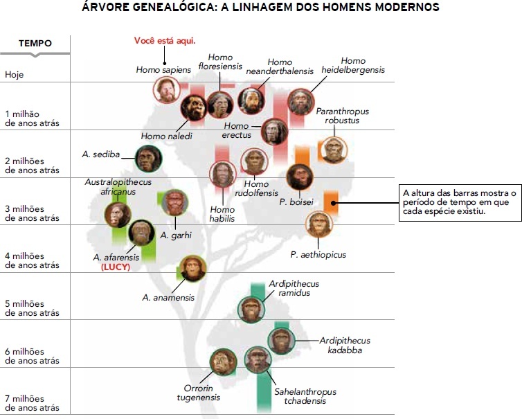 Com base nos conhecimentos científicos atuais sobre a evolução da espécie humana, referidos na reportagem e ilustrados na árvore genealógica, identifica-se o princípio de:
