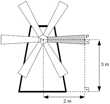 Com base no exposto, o menor tempo decorrido até que D. Quixote acerte, com sua lança, o ponto P da vela a uma altura de 2 m do solo, antes dele completar uma volta é