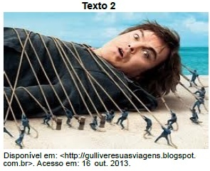 O Texto 2 é uma cena do romance Viagens de Gulliver, de Jonathan Swift, com o qual o conto de J. J. Veiga faz um intertexto ao discutir questões sobre o conhecimento humano e sua racionalidade.