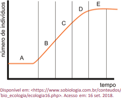 As populações possuem diversas características próprias, mensuráveis. Cada membro de uma população pode nascer, crescer e morrer, mas somente uma população como um todo possui taxas de natalidade e de crescimento específicas, além de possuir um padrão de dispersão no tempo e no espaço. A densidade populacional pode sofrer alterações. Mantendo-se fixa a área de distribuição, a população pode aumentar devido a nascimentos e a imigrações. A diminuição da densidade pode ocorrer como consequência de mortes ou de emigrações. Observe, no gráfico a seguir, a Curva S de Crescimento Populacional Padrão em função do tempo, esperada para a maioria das populações existentes na natureza, identificada pelas letras A, B, C, D, E. Essa curva é caracterizada por uma fase inicial de crescimento lento, em que ocorre o ajuste dos organismos ao meio de vida. Depois, ocorre um rápido crescimento, do tipo exponencial, que culmina com uma fase de estabilização, na qual a população não mais apresenta crescimento. Pequenas oscilações em torno de um valor numérico máximo acontecem, e a população, então, permanece em estado de equilíbrio.