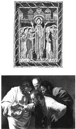 As imagens acima retratam a mesma passagem bíblica – a dúvida do apóstolo Tomé diante do Cristo ressurrecto. A primeira, acima, é uma ilustração medieval do saltério de Saint Albans, do século XII (“A dúvida de São Tomé”, artista desconhecido), e a segunda, abaixo, é a pintura de Caravaggio “A incredulidade de São Tomé”, de 1599.