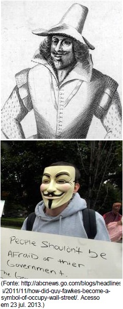 Na figura abaixo vemos à esquerda uma ilustração de Guy Fawkes, inglês católico morto em 1605 após tentar explodir o Parlamento inglês na “Conspiração da Pólvora”, e um manifestante inglês usando a máscara de Guy Fawkes em 2011 (inspirada na graphic novel “V de Vingança”, transformada em filme em 2006) e portando um cartaz no qual se lê: “O povo não deve temer seu governo”.