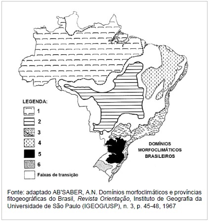 Num clássico trabalho publicado em 1967, o geógrafo brasileiro Aziz Nacib Ab\'Saber caracterizou seis grandes domínios morfoclimáticos, apresentados no mapa ao lado, cujas áreas estão relacionadas a regiões climatobotânicas, áreas geopedológicas, províncias fitogeográficas e regiões hidrológicas particularmente bem definidas.